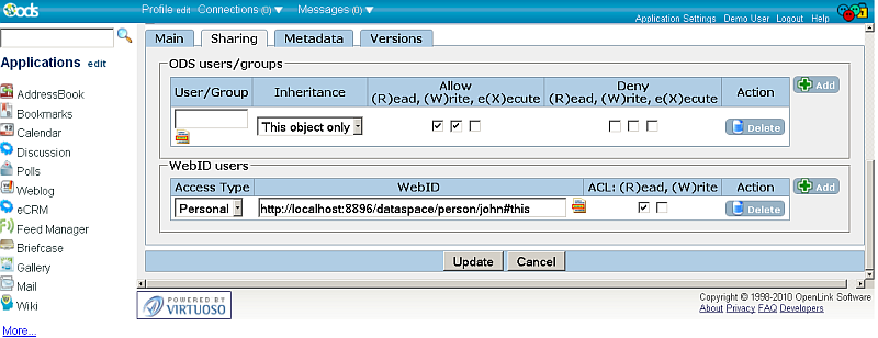 3. Log into ODS-Briefcase as user "Demo" (a Person Entity) and then share an ODS-Briefcase hosted resource explicitly with "John" (solely) via his WebID: