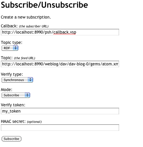 Before performing any of these steps, read about the Virtuoso PubSubHub implementation, and make sure pubsubhub_dav.vad is installed.