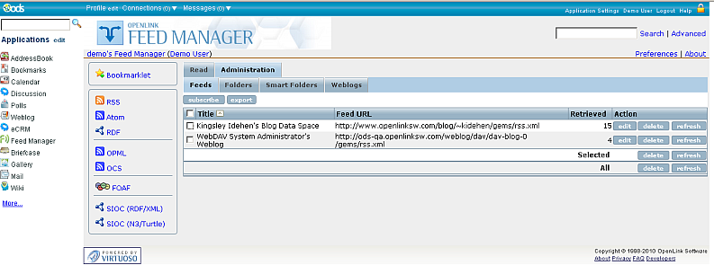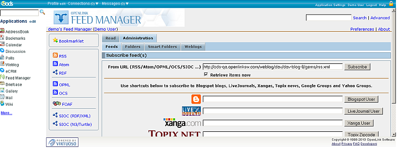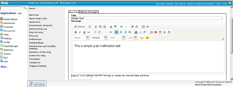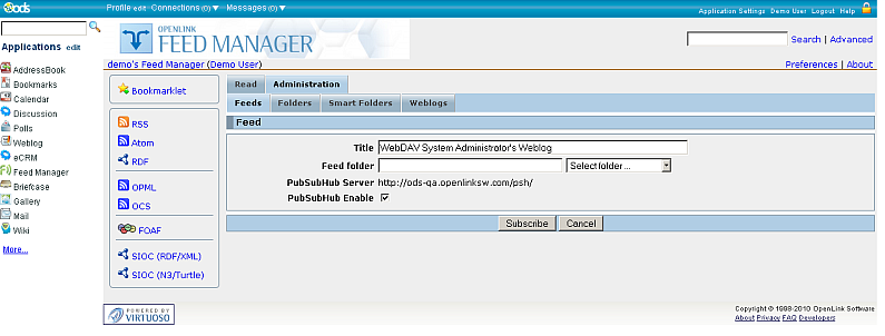 For our test, we use ODS-Weblog as publisher and ODS-Feed Manager as subscriber.