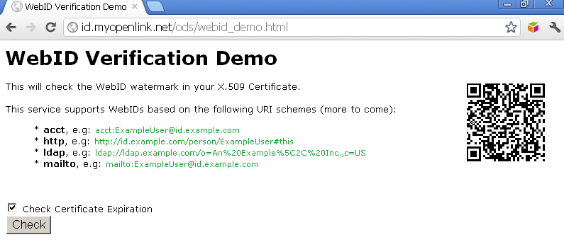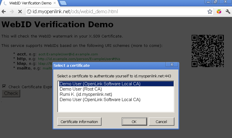 - Using Virtuoso's WebID Verification Proxy Service with a WebID-bearing X.509 certificate