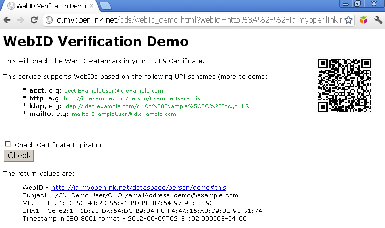 - Should be presented the extracted WebID value, the subject, MD5, SHA1 and Timestamp in ISO 8601 format: