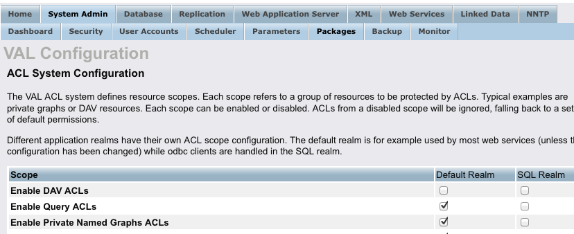 - The enabled ACL scope is associated with the DefaultRealm - this is what binds an ACL to the HTTP functionality realm and this will be visible via the Conductor Configuration UI for VAL or it can be lookedup via its HTTP URI using the Faceted Browser or SPARQL.