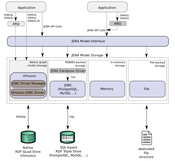 The Virtuoso Jena RDF Data Provider is a fully operational Native Graph Model Storage Provider for the Jena Framework, which enables Semantic Web applications written using the Jena RDF Frameworks to directly query the Virtuoso RDF Quad Store.